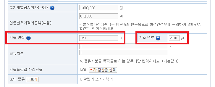 건축물대장을 보고 건물면적과 건축 연도를 입력합니다.