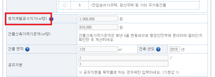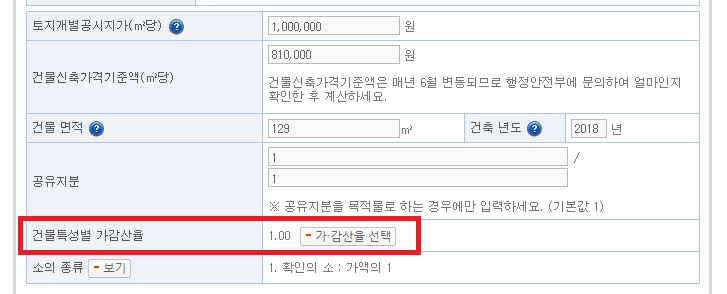 건물신축가격기준액은 위 건물용도에서 대상건물을 선택하셨다면 자동으로 입력됩니다.